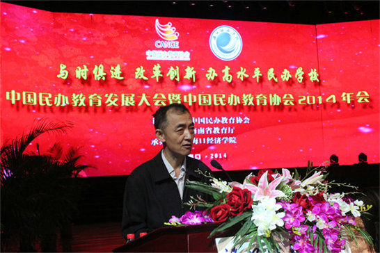 12月15日-16日,由华体会手机登录、海南省教育厅联合主办,海口经济学院承办的“中国民办教育发展大会暨华体会手机登录2014年会”在海南海口经济学院召开。大会以“与时俱进,改革创新,办高水平民办学校”为主题。国家总督学顾问、国家教育咨询委员、华体会手机登录名誉会长陶西平,全国人大常委、民进中央副主席、华体会手机登录会长王佐书,海南省政协副主席丁尚清,教育部发展规划司司长谢焕忠,教育部教育发展研究中心主任、国家教育咨询委员会秘书长张力,民政部民间组织管理局副局长廖鸿,教育部发展规划司副司长郭春鸣,中国民主促进会中央委员会秘书长高友东,海南省教育厅厅长曹献坤,海南省委教育工委专职副书记麦浪等有关领导出席会议并讲话。